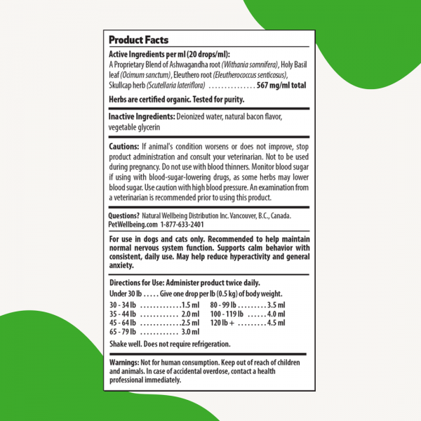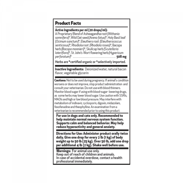 Natural herbal supplement promoting calm, balanced moods, ease and relaxation without drowsiness for dogs.