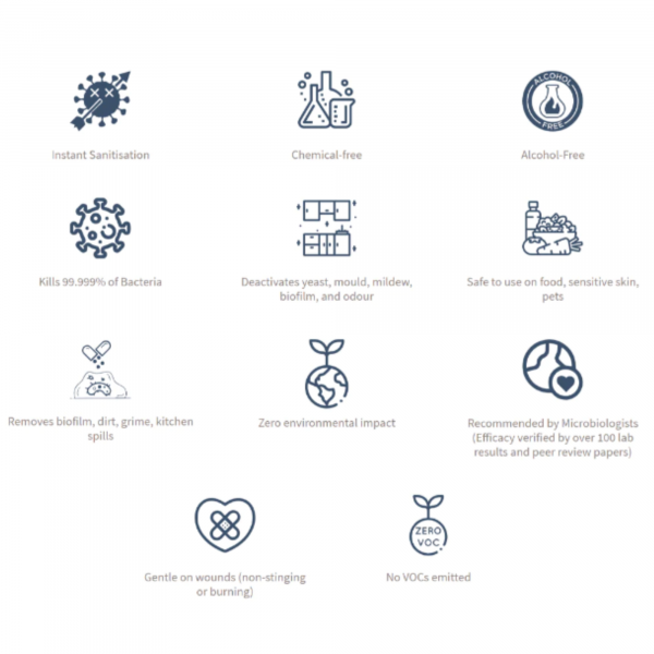 A must have all-natural unscented chemical-free cleaner and disinfectant made from Korean technology Stabilized Activated Water with a broad spectrum of uses around the home, sensitive skin, food, humans and animals.
