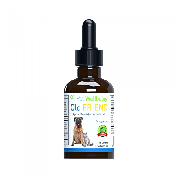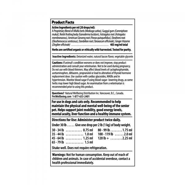 Natural daily herbal supplement promoting optimal health for common aging-related issues such as joint health, cardiovascular support, cognitive function, and inflammation reduction for senior cats.